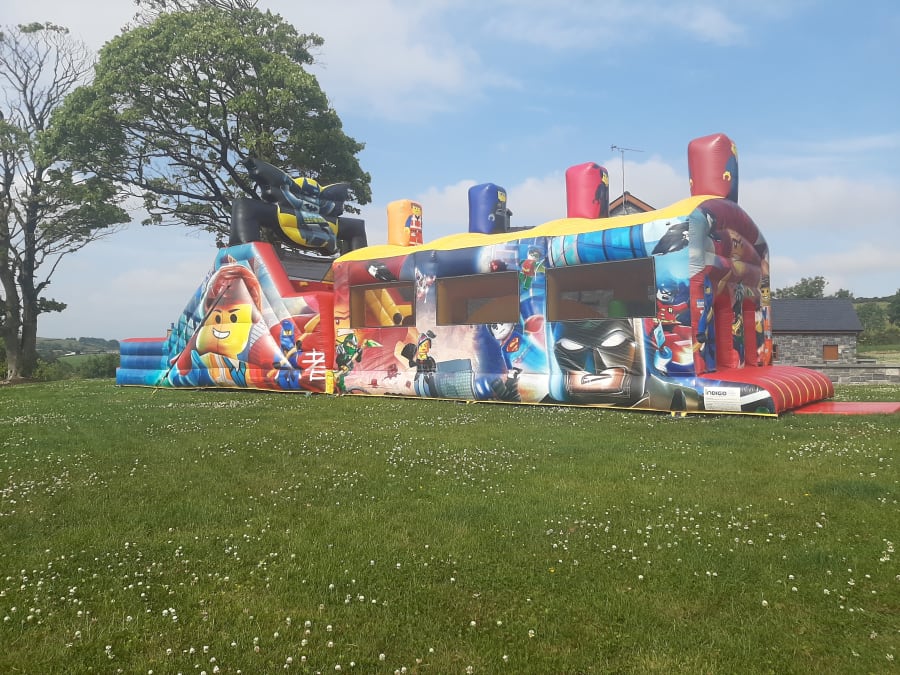 50 ft lego obstacle course a big hit with both young ane older kids.Inside you will find many obstacles in your way plus a mini slide before your faced with its climbing wall to reach the top of the main slide . Down you go and out to it do all over again. WEEKEND HIRE DELIVERD FRIDAY SOMETIME AND PICKED UP MONDAY !!!! THIS CAN ONLY BE SET UP ON GRASS...
