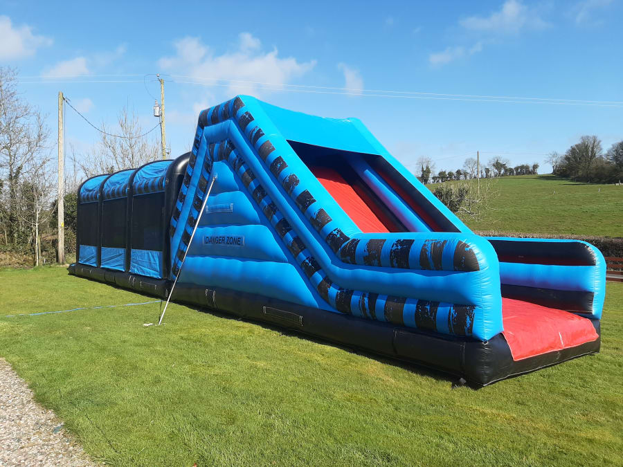 Danger zone 60ft . Big is not the right word for this obstacle course its massive !! Inside you go and be faced with a rough ride before your free!! LOADS of obstacles /walls/ tunnels bish bash etc before your faced with a 70 degree wall to the top of this xxxl slide get out quick before you get light headed up there!! This unit has the highest slide on an obstacle course on this island FACT!! BOOK ONE DAY GET SECOND DAY FREE! HIRE in monagahn cavan louth armagh. THIS CAN ONLY BE SET UP ON GRASS..