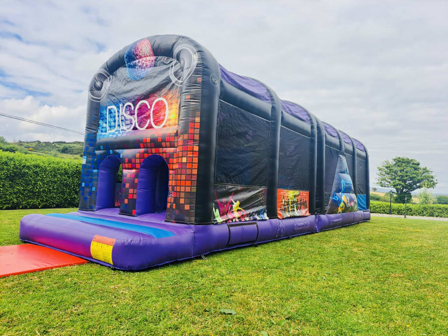 DISCO OBSTACLE COURSE 42FT LONG. This lovely eye catching unit is jammed packed with lots of obstacles inside including bish bash knocking walls tunnels and climb thru hoops . Great steep climbing wall up to a nice high slide. NB. THIS DISCO OBSTACLE DOES NOT INCLUDE LIGHTS/MUSIC.... HIRE IN MONAGHAN CAVAN LOUTH ARMAGH. BOOK ONE DAY GET SECOND DAY FREE. Disco obstacle course.